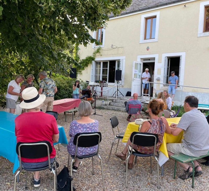Het is voor ons altijd even zoeken waar we gaan zitten. Want we spreken en verstaan wel wat Frans, maar om een echt gesprek te voeren is toch wel moeilijk. Het overgrote gedeelte van de bevolking (vooral de ouderen) spreken een dialect. Het Berichon. Als we een strategisch plekje hebben opgezocht komen gelukkig onze buren precies tegen over ons zitten. En daar kunnen we toch wel redelijk mee praten.