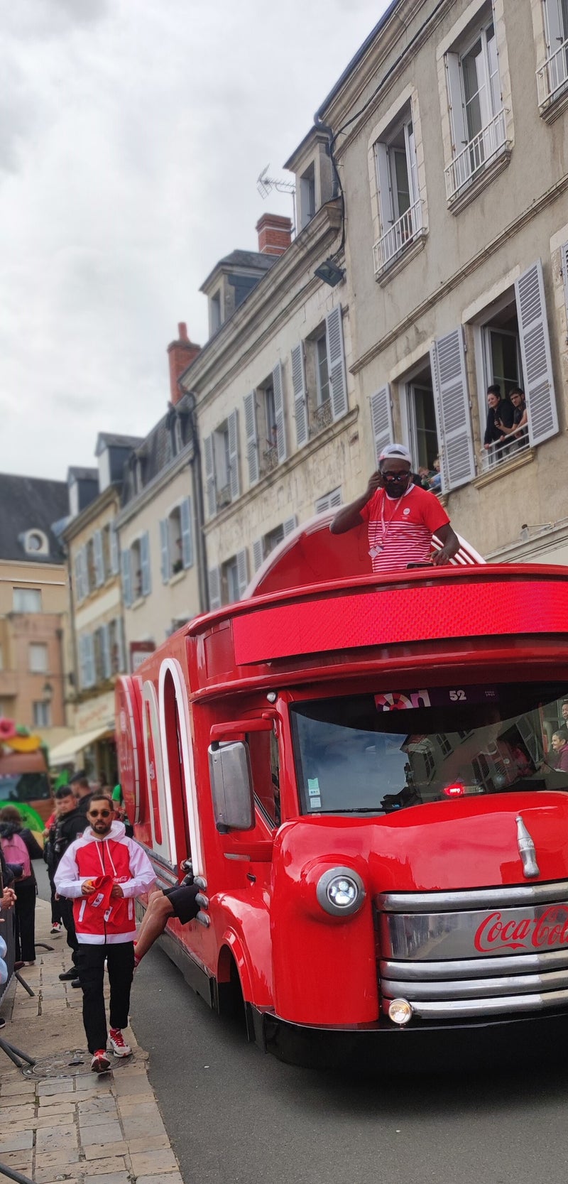 Maar om 10 uur lukte het ons om toch via een klein sluipweggetje op 200 meter van het centrum de auto te parkeren. Op het grote plein waar altijd de markt is, zou de tocht eindigen. Dus wij gingen daar naartoe. En toen stonden er al honderden mensen. Wat elk uur met honderden werd aangevuld. Maar wat een show allemaal eromheen. Dansgroepen, zanggroepjes, een harmonieorkest. Allemaal om de tijd op te vullen want zo rond 1 uur zou de fakkel op het marktplein aankomen. Naast een grote overdekte tent waar diverse optredens waren te zien konden we op een beeldscherm zien hoe de fakkeldraagster geflankeerd door een grote groep lopers richting onze kant kwam. Maar wat ons ook opviel was de gigantische hoeveelheid gendarmerie. Op motoren en busjes vol met gendarmerie die steeds het rondje om het plein inspecteerde. Maar op het plein stonden permanent ook wel meer dan 25 gendarmes. Een helikopter boven de stad. En dat allemaal om een fakkel van A naar B te brengen. En probeer niet voorbij een dranghek te komen. Je werd onmiddellijk teruggefloten. Ja, en dan net als bij een wielerronde, vele reclamewagens. Ook natuurlijk auto’s met officials. Ook 2 bussen waarbij je allemaal olympische dingen kon kopen. Petjes, t shirts etc. Maar als dan de fakkeldraagster komt geflankeerd door een groep lopers is het ook zomaar allemaal weer over. Het harmonieorkest probeert nog de mensen te vermaken, maar langzaam loopt het plein weer leeg.